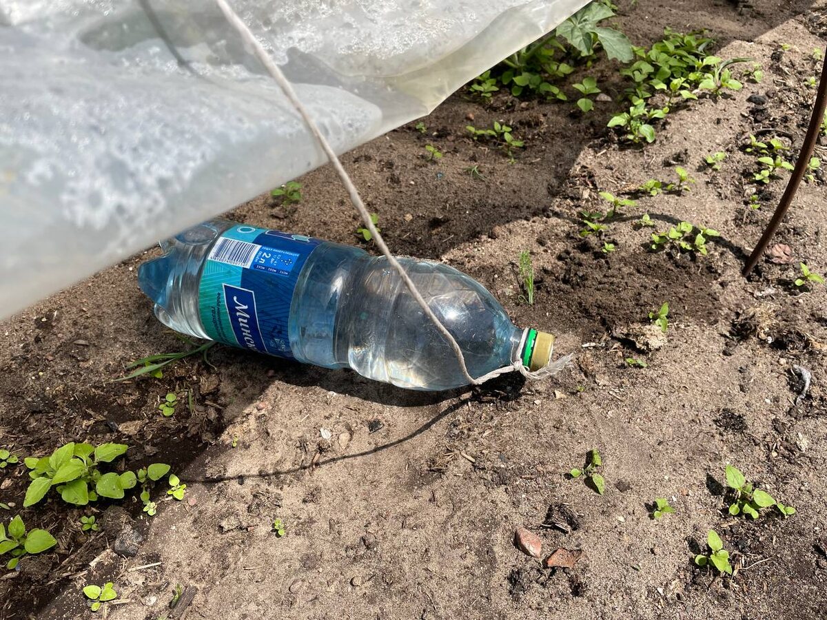 Если возникнет необходимость приоткрыть парник на день, бутылки можно положить на грядку, что не будет мешать перемещению по участку.