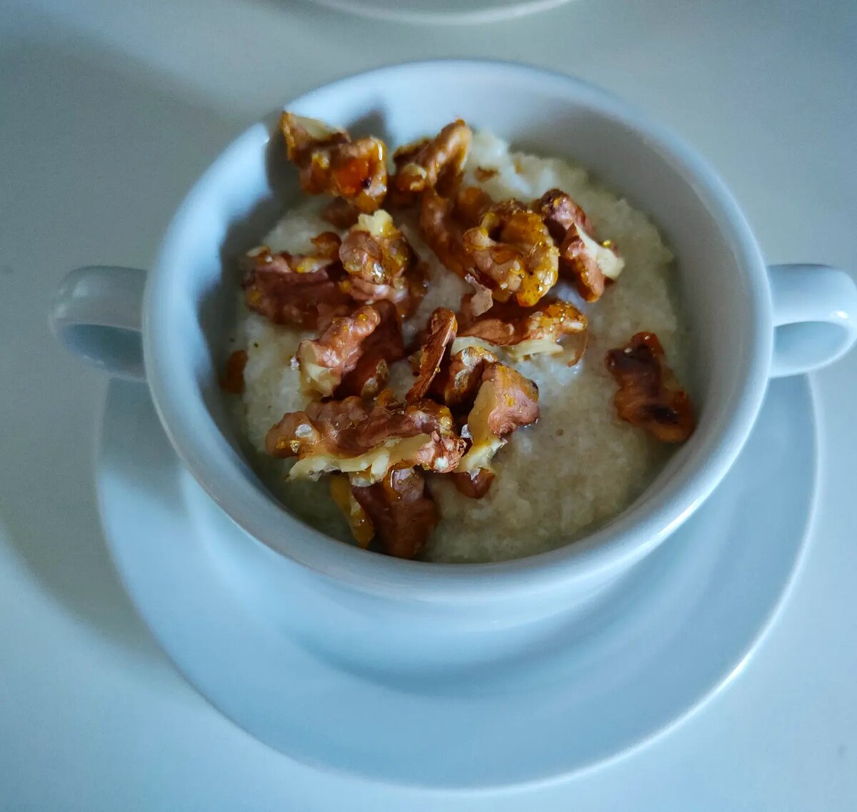 При сервировке каши стоит обратить внимание на её оформлении. Каша угощает глаз и аппетит, когда её щедро посыпают карамелизированными орехами. Такое сочетание вкусов — от молочной нежности до хрустящей сладости орехов — делает завтрак по-настоящему незабываемым.