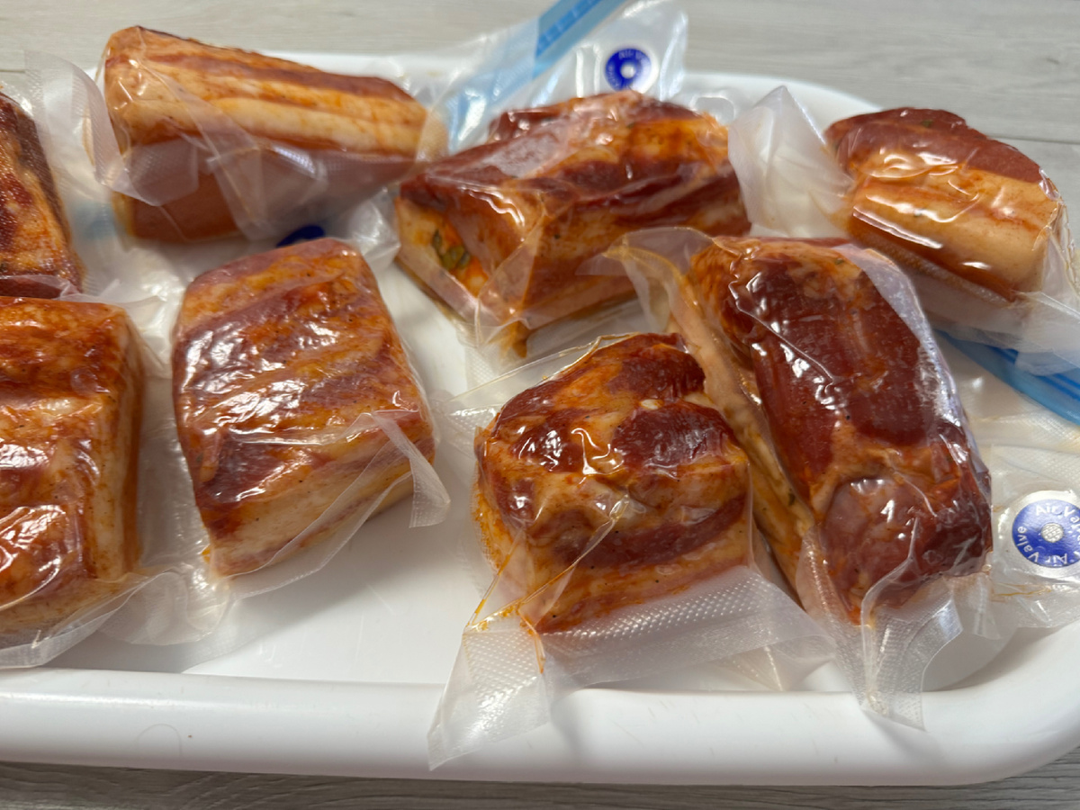 - Обильно натрите каждую часть грудинки полученной смесью и поместите в целлофановые пакеты.