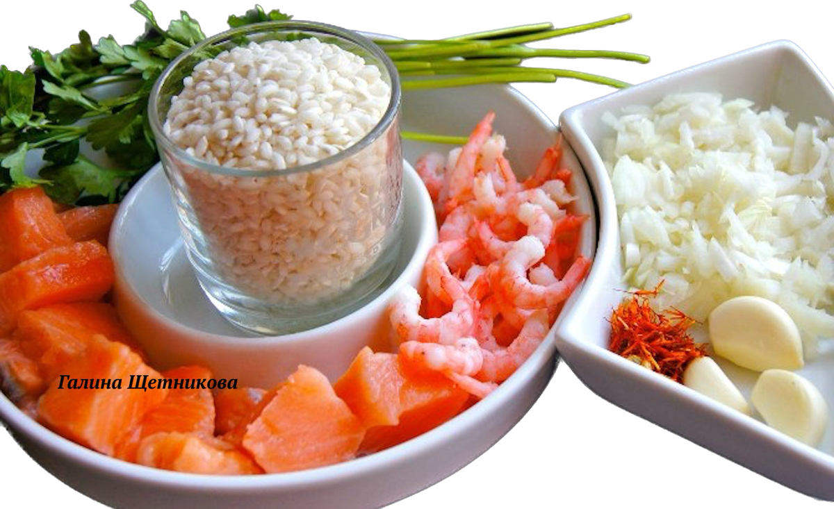 Основным героем этого блюда является рис сорта Арборио — именно он придаёт ризотто кремовость и насыщенность. Дополнением к этому бережно раскрываются ароматы семги и креветок, создавая феерию вкусов на каждой тарелке. Для создания ризотто потребуется: