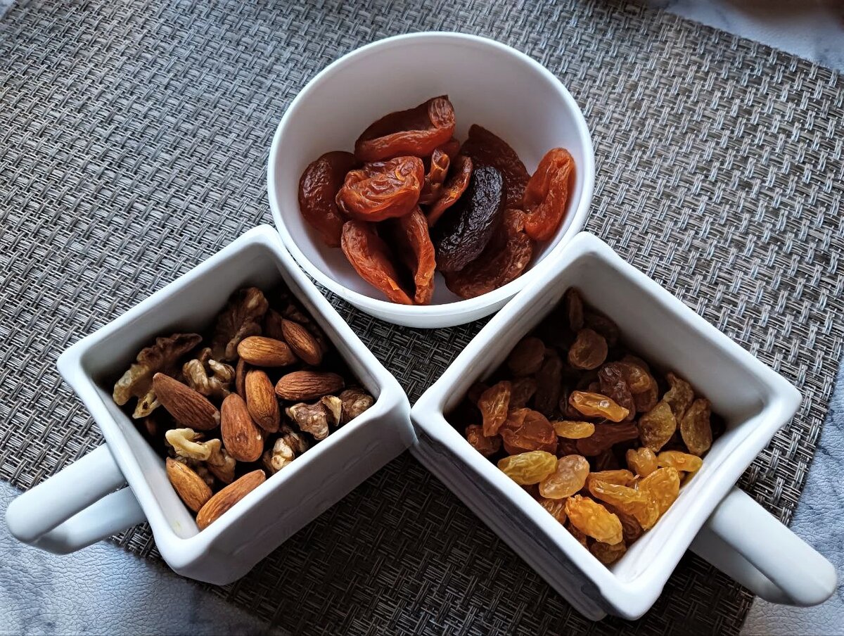 Сначала орехи, изюм и курагу тщательно промывают и просушивают.