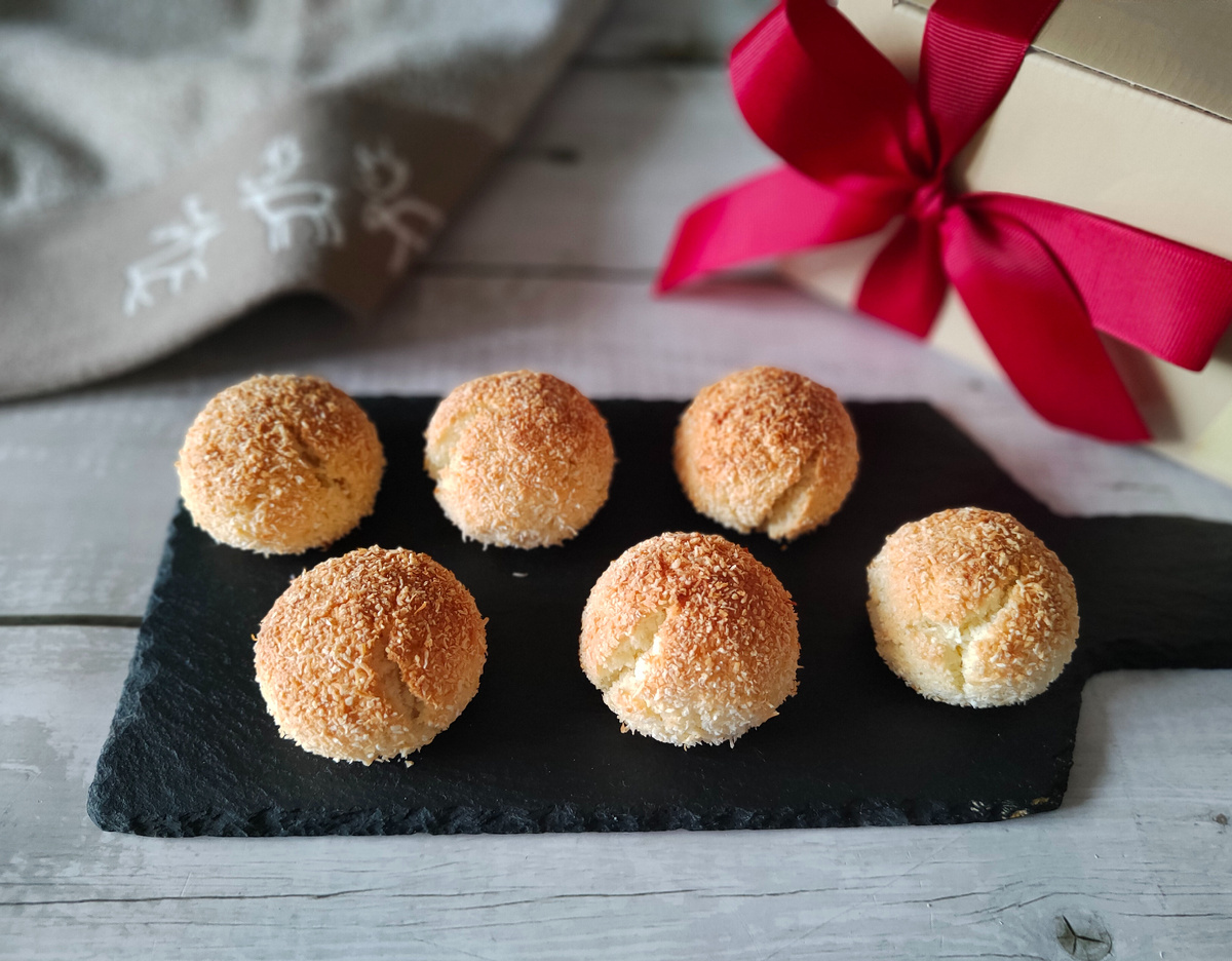 Разогрейте духовку до 180 градусов. С помощью влажных рук отщипните тесто на порции по 30 г, скатайте их в шарики и обваляйте в оставшейся кокосовой стружке. Выложите их на противень, не расплющивая.