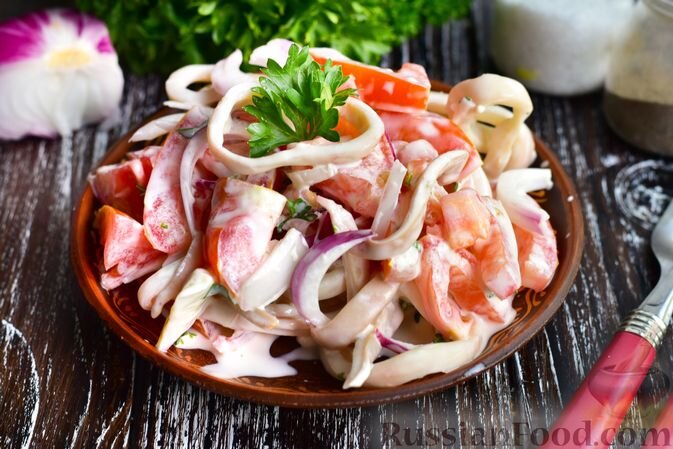 Закончить гастрономическое путешествие можно салатом "Алые паруса" с кальмарами и помидорами, который удивит своими пикантными нотами и свежестью.