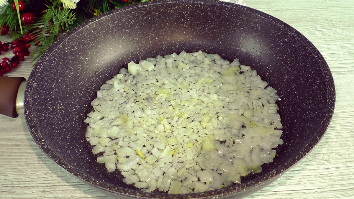 В сковороде разогрейте немного масла и обжарьте нарезанный лук до прозрачности. Затем добавьте капусту — солёную или квашеную на ваш выбор, и тушите минут 10 на среднем огне.