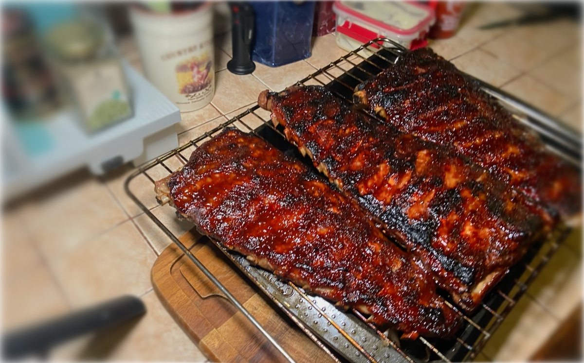 Снять пленку с рёбер и щедро натереть специями, обернуть пленкой и оставить мариноваться на 2-3 часа.Затем завернуть рёбра в пергамент и фольгу и выпекать в предварительно разогретой до 150°C духовке в течение часа.Приготовить глазировку, смешав все ингредиенты и подогрев их в сотейнике.Убрав фольгу и пергамент, обмазать ребра глазировкой и поставить на гриль до образования золотистой корочки, смазывая каждый 5 минут.Нарезать готовые рёбра и подавать к столу!Теперь вы можете насладиться восхитительным вкусом рёбер и крыльев, приготовленных по оригинальному рецепту. Приятного аппетита!