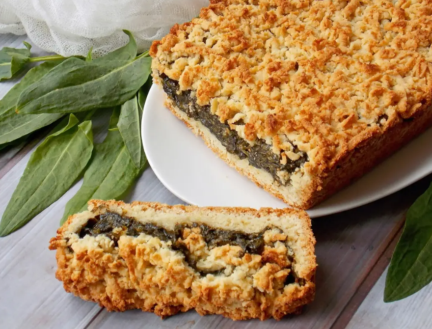 Затем достаем замороженную часть теста и натираем её прямо на начинку щавеля. В конце окончательно ставим пирог в духовку, предварительно разогретую до 180 градусов, и выпекаем около 20-25 минут до появления золотистой корочки.