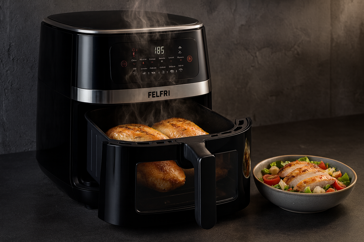 Аэрогриль FELFRI с мощностью 2200 Вт окажется идеальным помощником в приготовлении Цезаря, гарантируя хрустящие крутоны и сочное мясо без лишних хлопот.