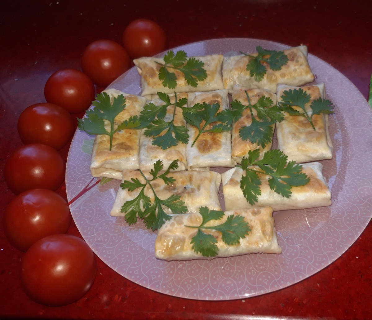 Лаваш был нарезан на небольшие прямоугольники, а из сыра и зелени были смечены аппетитные конвертики. Такие мини-пирожки быстро исчезли за столом, оставив за собой только приятные воспоминания и фотографии.