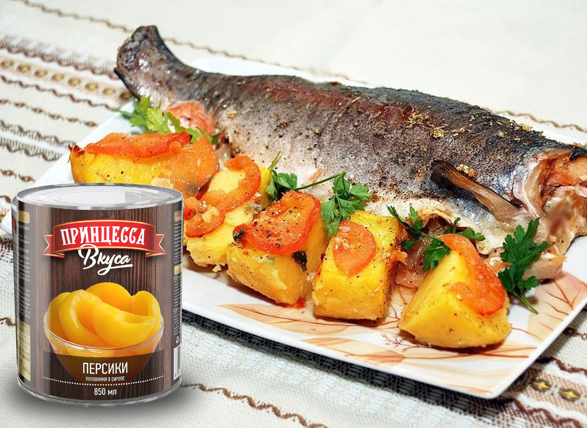 Когда форель с овощами будут готовы, сервировка действительно важна. Листья свежего салата станут основой для подачи. На них укладываются ломтики персиков, картофеля и кабачков, а сверху размещается рыба, политая сочным бульоном, образовавшимся во время приготовления.