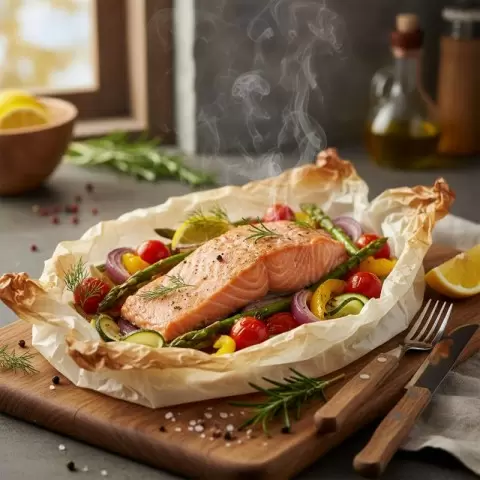 5. Запекание: Плотно закройте конверты, складывая края, и отправьте их в духовку на 20-25 минут, пока рыба не станет непрозрачной.