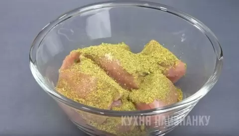 Первым делом филе индейки нужно нарезать на кусочки средних размеров. После этого мясо необходимо приправить солью и любимыми специями — например, пряной смесью из овощей и зелени. Можно добавить немного оливкового масла, тщательно перемешать и оставить мариноваться на несколько часов. Хотя можно готовить и сразу, настаивание значительно улучшает вкус.