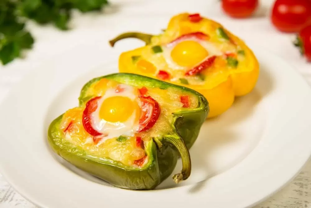 Выпекать в предварительно разогретой духовке в течение 10 минут. Затем аккуратно разбить по одному перепелиный яйцо на каждый перец и вернуть в духовку еще на несколько минут.
