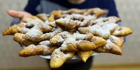 Утром раскатайте тесто толщиной 3-4 мм и нарежьте ромбиками. В центре каждого сделайте надрез и аккуратно выверните. Обжаривайте заготовки в растительном масле, переворачивая до золотистой корочки. После жарки положите их на бумажное полотенце, чтобы убрать лишний жир. Подавайте с медом, сгущенкой или посыпьте сахарной пудрой — это идеальное решение для завтрака!