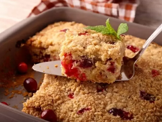 Следующим шагом станет подготовка начинки. Для этого бруснику следует перемешать с сахаром и крахмалом, а затем аккуратно выложить на слой теста. Уровень начинки можно без проблем выровнять с помощью лопатки. Оставшиеся крупинки теста распределяются сверху — это придаст печенью особенно привлекательный вид.