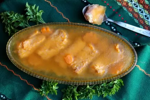 Филе рыбы нарежьте на кусочки весом около 30 граммов. После того, как бульон будет готов, процедите его в кастрюлю и добавьте кусочки рыбы. Варите буквально 10-15 минут. Важно, чтобы бульон был достаточно густым, так как именно он обеспечит желирующие свойства блюда.