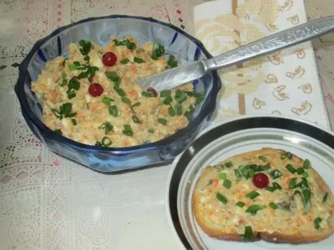 Намазывайте закуску на мягкую сторону гренок и выкладывайте на тарелку, украшая нарезанными перьями зеленого лука и ягодами красной смородины. Остальную намазку помещают в салатник и ставят рядом на стол.