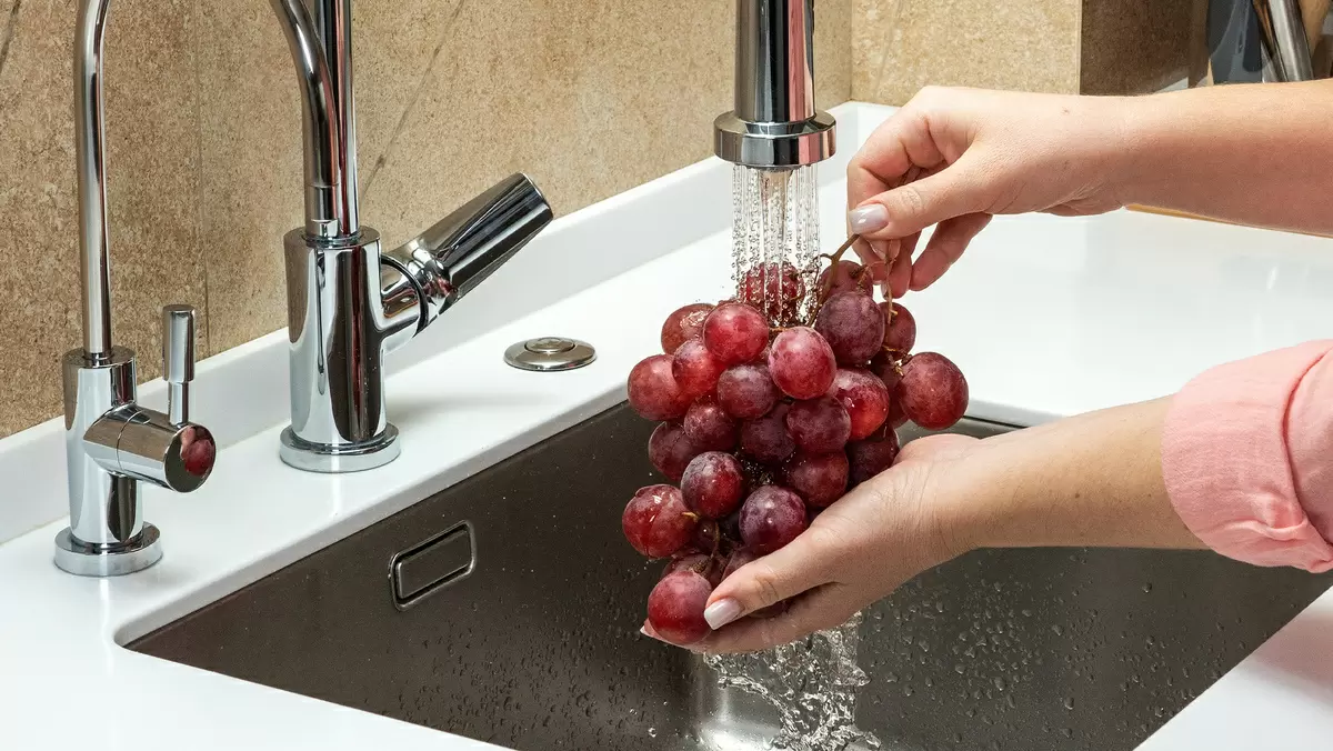 - Виноград: Мыть эти ягоды не менее важно. Гроздья винограда можно просто промыть под холодной водой. Снимать ягоды с ветки не требуется — достаточно подержать гроздья под струей в течение минуты.