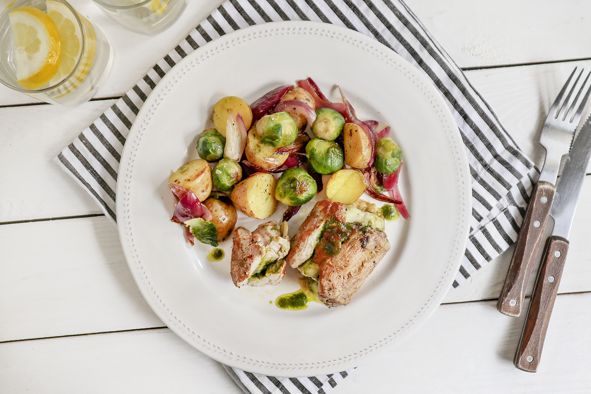 Пока картофель варится, подготовьте свиную вырезку: нарежьте ее порционно, глубоко сделав продольный надрез, который создаст кармашек для начинки. Посолите и поперчите мясо как снаружи, так и внутри. Нанесите на внутреннюю часть соус песто, добавьте моцареллу и зафиксируйте отверстие зубочистками.