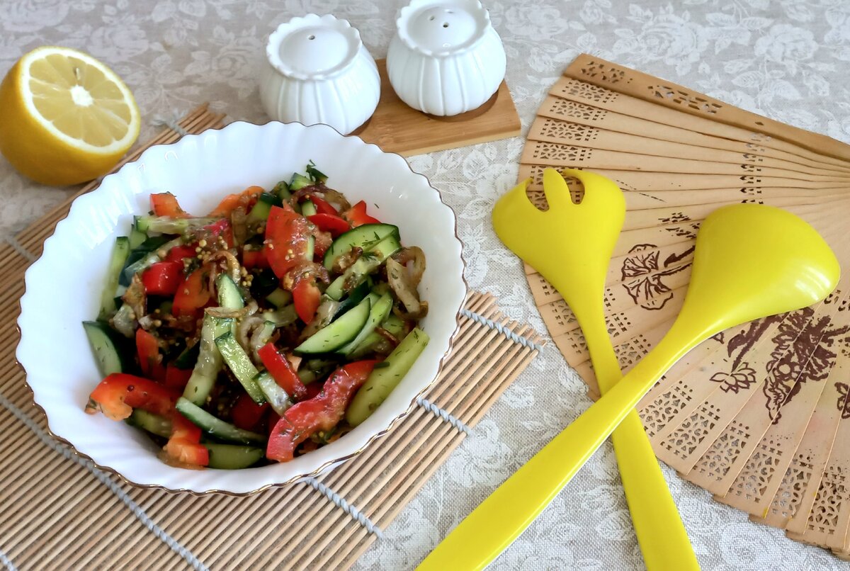 Этот освежающий салат станет настоящей находкой для теплых летних дней, когда хочется легкости и ярких вкусов. Простой в приготовлении, он радует не только глаз, но и вкус с каждым укусом благодаря уникальной заправке на основе соевого соуса и дижонской горчицы. Жареный лук добавляет интересный аромат, а сочетание свежих овощей делает его идеальным дополнением к шашлыкам и мясным блюдам.