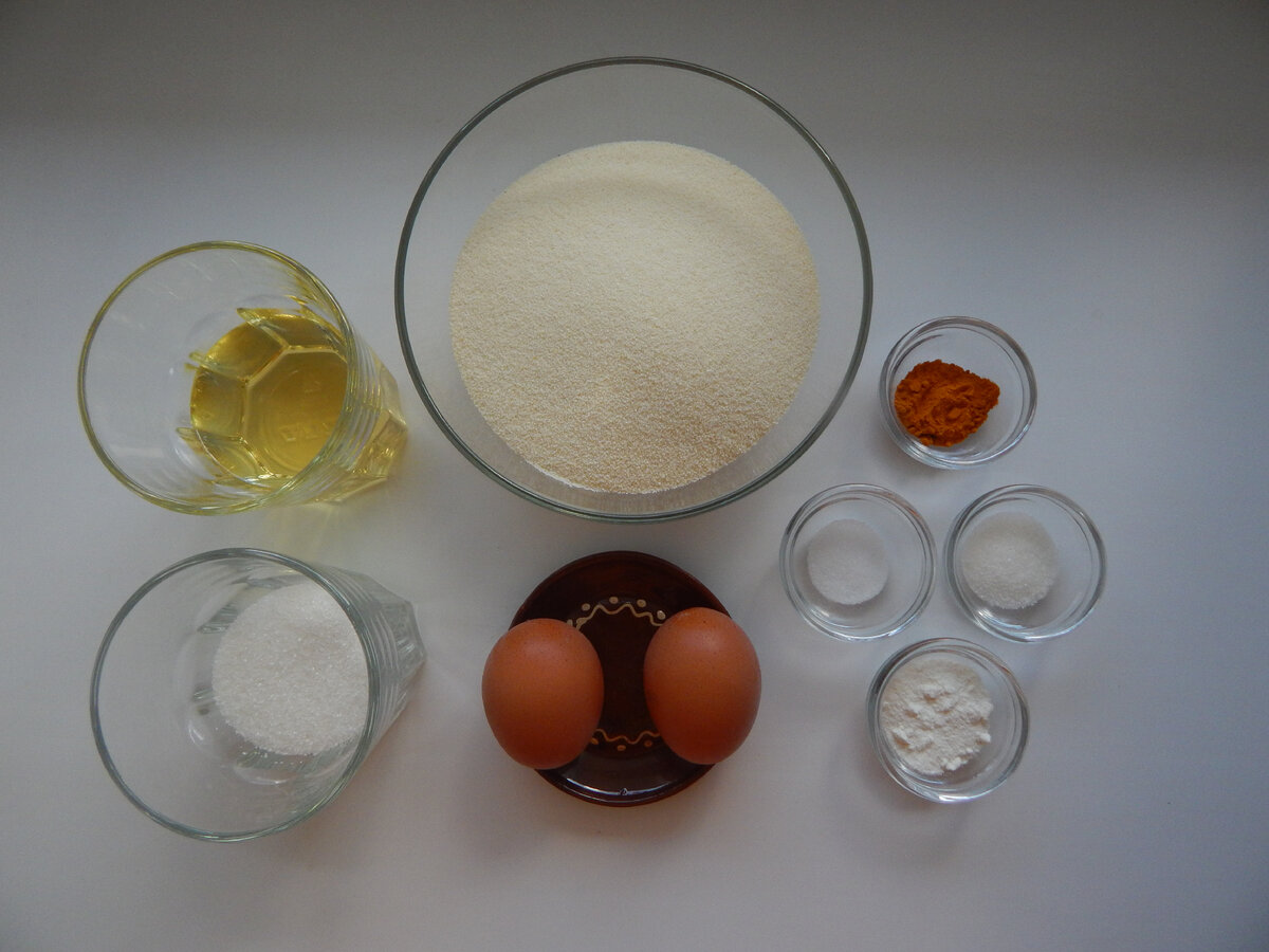 - Сначала стоит соединить все сухие ингредиенты: манку, разрыхлитель и куркуму. Можно отложить в сторону.
