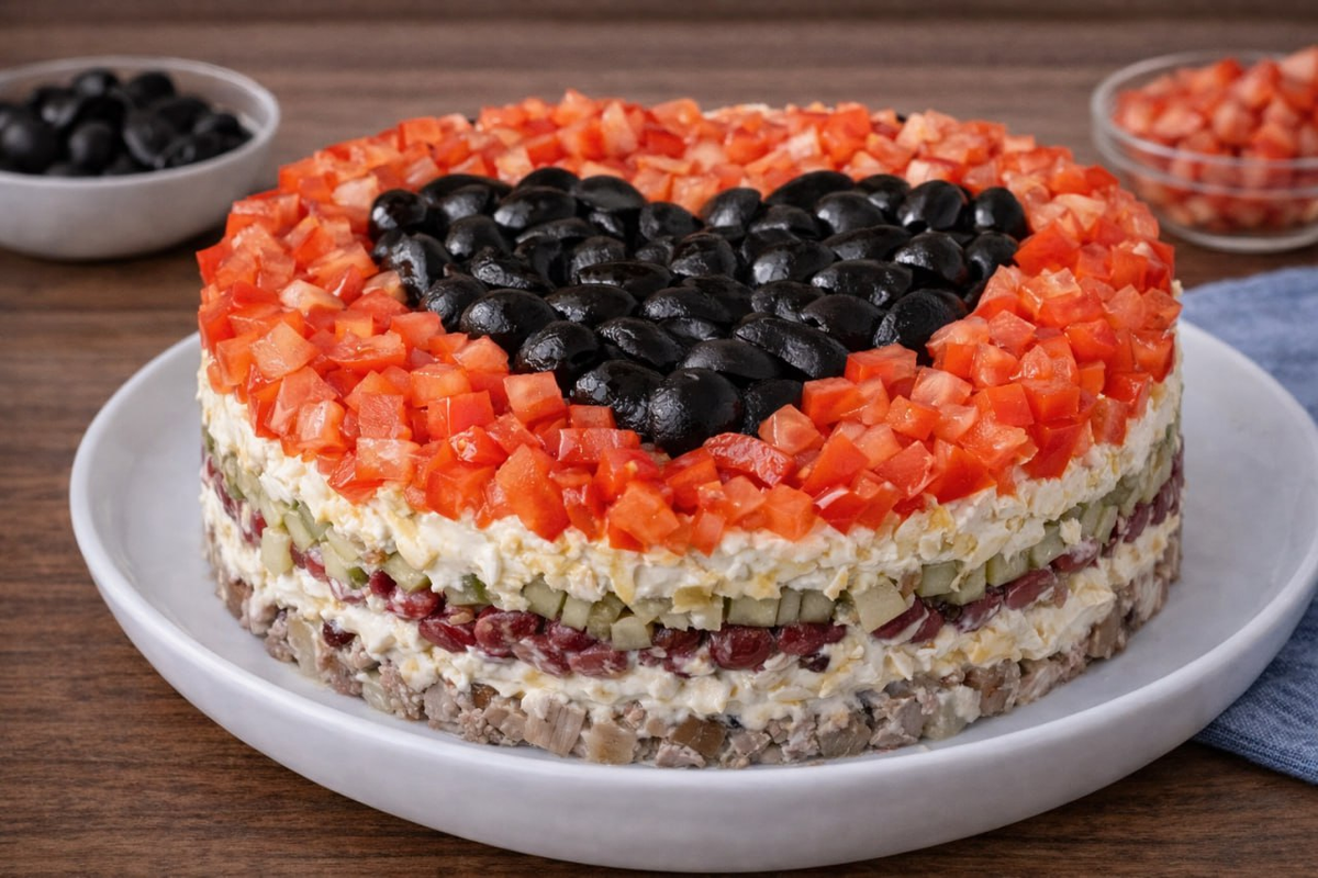 4. Составляем салат слоями. Используйте разъемную форму или прозрачный салатник. На дно выкладывайте говядину, чуть прижимая, затем каждый слой покройте майонезом, чтобы добиться нужной текстуры. Продолжайте с луком, фасолью, огурцами, картофелем и помидорами. Завершите оформление маслинами, которые можно нарезать кругами для красивого представления.