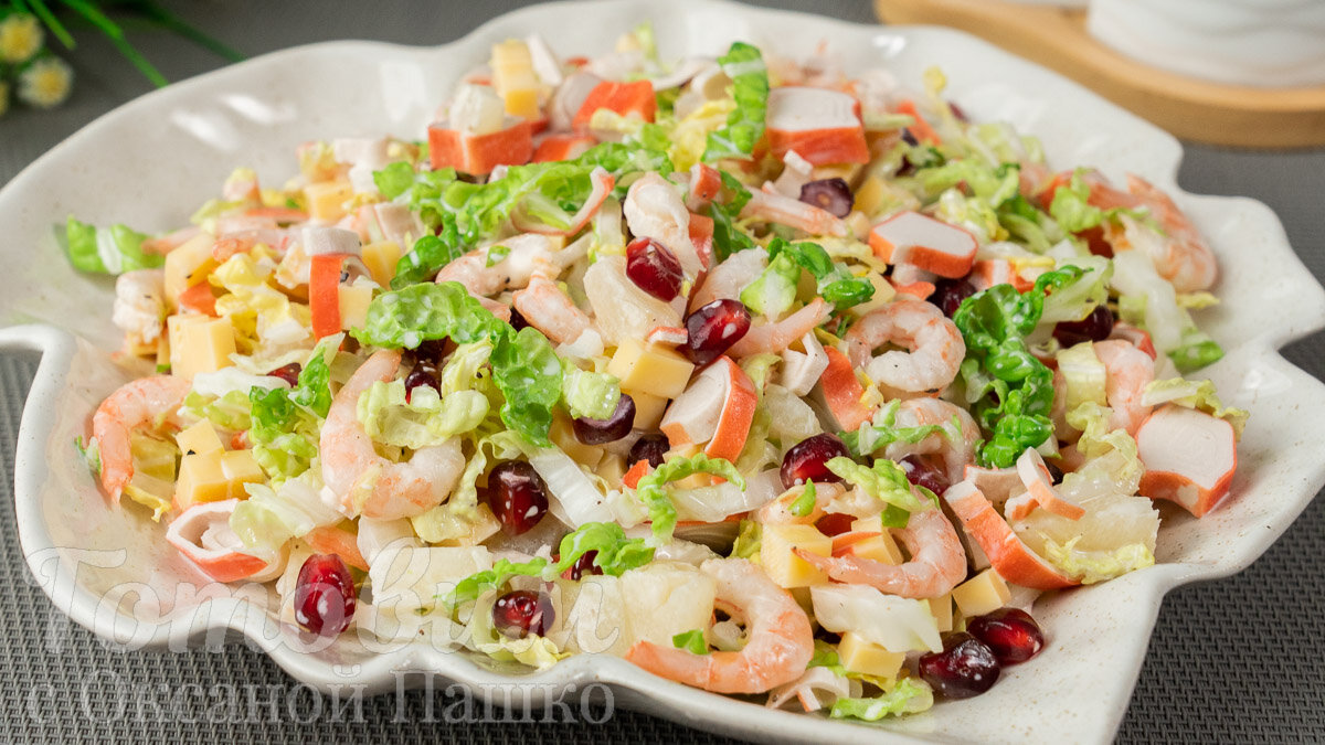 Этот салат с креветками и крабовыми палочками станет настоящим украшением любого торжества! Его уникальное сочетание нежных морепродуктов и сладких фруктов обеспечивает взрыв вкусов, а свежая пекинская капуста добавляет легкости. Этот изумительный деликатес точно понравится не только поклонникам морепродуктов, но и всем, кто ценит оригинальные и вкусные блюда.
