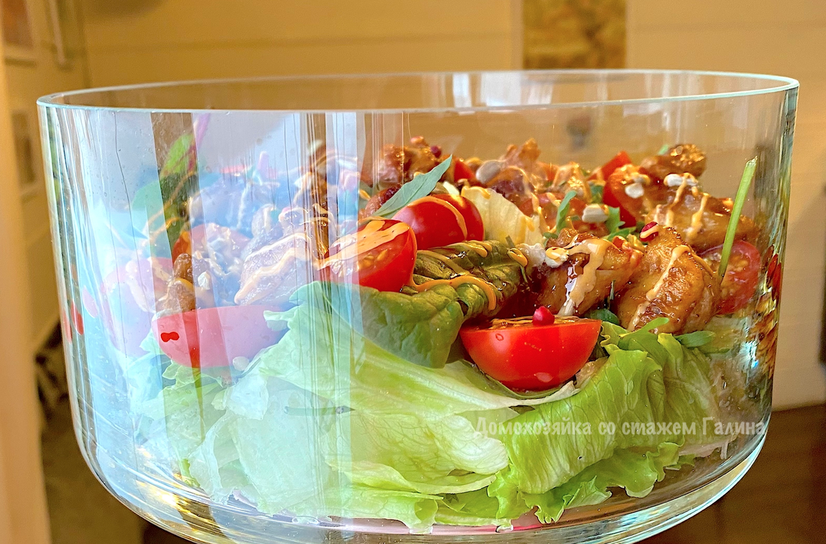 Кусочки рыбы и половинки томатов черри аккуратно выкладываются на листья салата. После этого блюдо можно полить кунжутным маслом и соусами якитори и спайси. Для свежести отлично подойдет немного лимонного сока. В завершение салат посыпается смесью: семена подсолнечника, тыквенные семена и дробленые орехи лещины с добавлением розового перца.