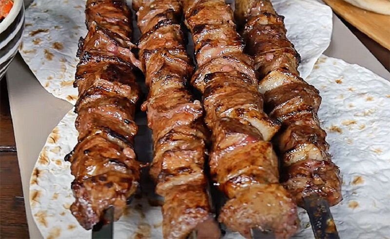 Шашлык из печени жарится значительно быстрее, чем мясной: обычно достаточно 10-12 минут. Подают готовое блюдо с тонким лавашем, свежими овощами и зеленью.