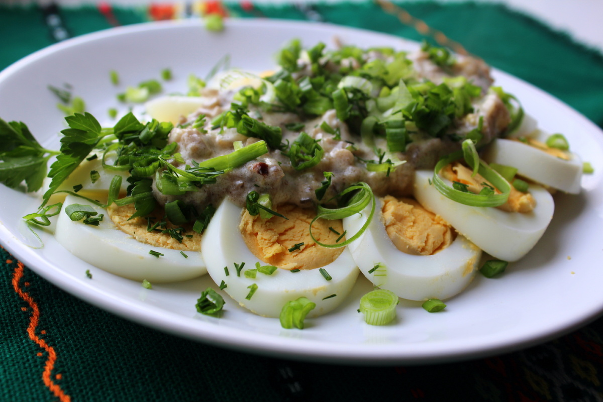 4. Вареные яйца нарезать кружочками и выложить на красивое блюдо. Сверху аккуратно распределить грибную начинку и по желанию присыпать свежей зеленью.
