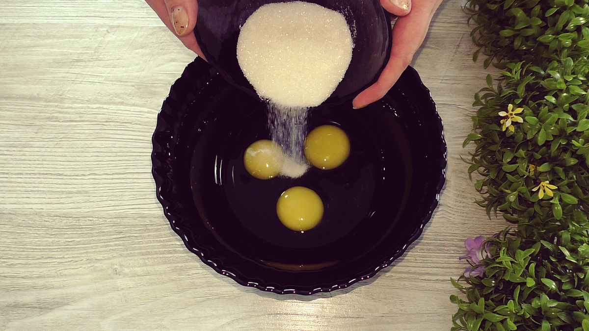1. В глубокой миске соединить яйца, щепотку соли и сахар, затем хорошо перемешать.