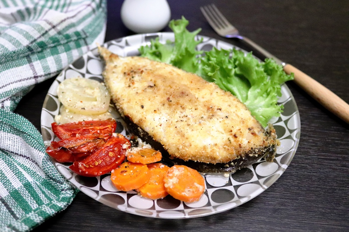 Перед запеканием полейте все ингредиенты растительным маслом и отправляйте в разогретую до 200°C духовку. Запекайте около 40-45 минут. Панировка должна подрумяниться, а рыба останется внутри нежной и влажной. Овощи служат отличным гарниром и дополнением к этому блюду.