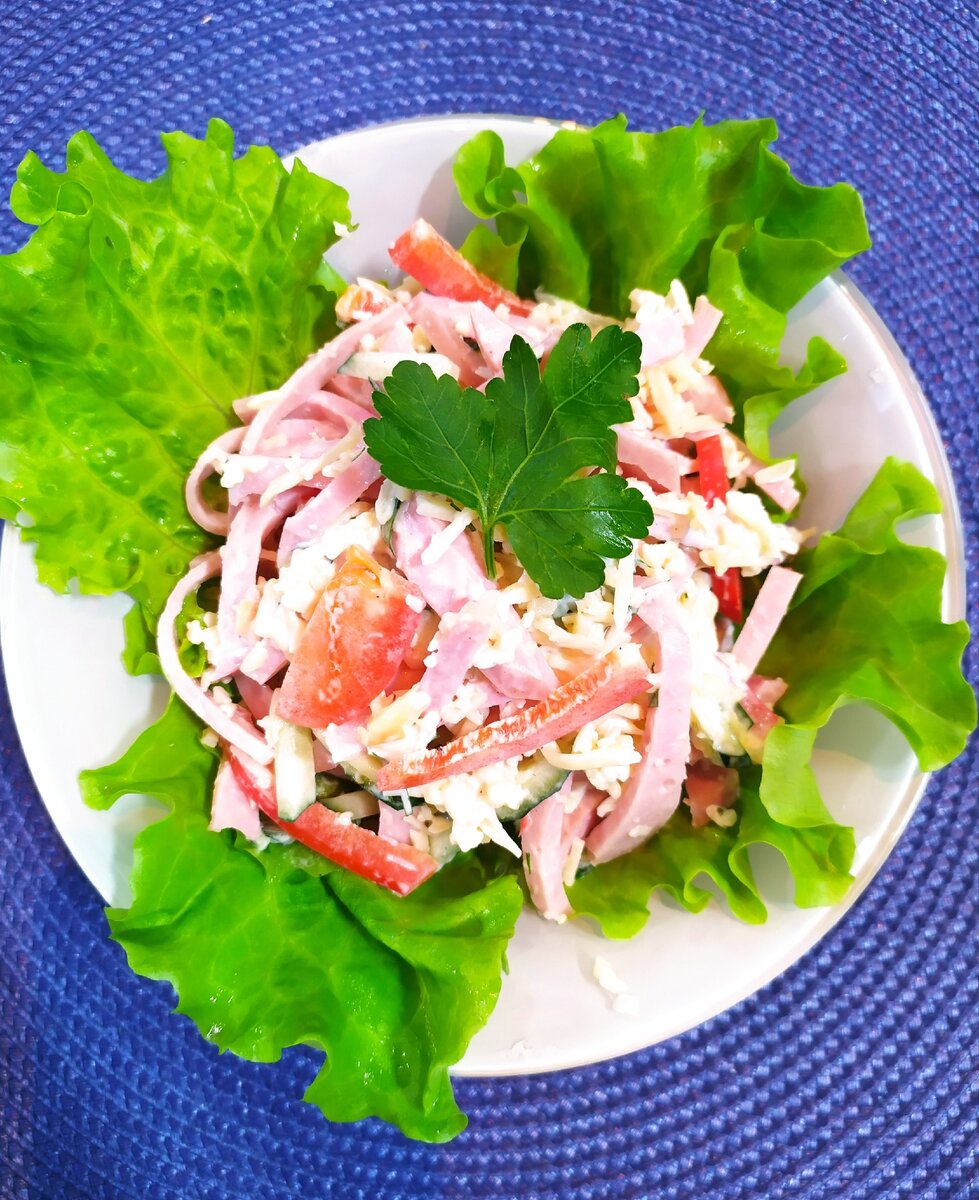 Теперь объединим все компоненты: в глубокой миске смешать сыр, ветчину, огурцы, сладкий перец и петрушку. Посолить и поперчить по вкусу, затем добавить майонез и тщательно перемешать. Подавайте салат на свежих листьях салата.