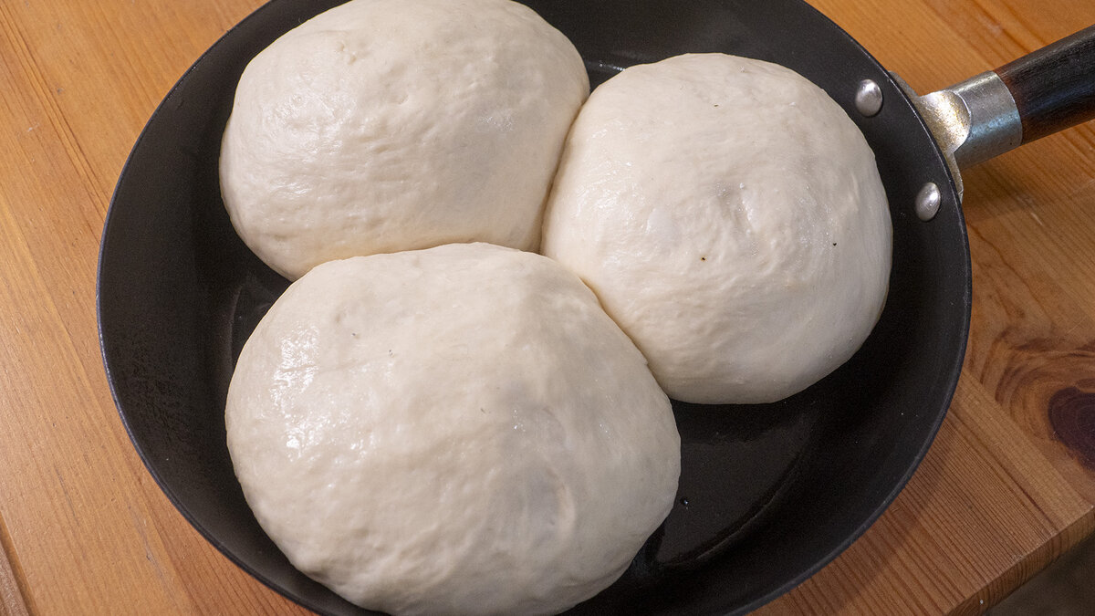 В чаше тестомеса смешать муку, сахар, воду, дрожжи и растительное масло до получения однородной массы. Добавить соль и вымесить еще 3-4 минуты. Затем сформировать из теста шар и разделить его на 6 равных частей. Шарики разместить в смазанной растительным маслом емкости, накрыть полотенцем и оставить на 40 минут.
