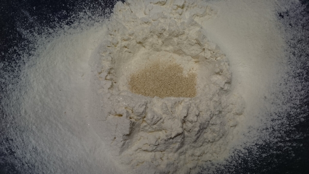 Процесс начинается с просеивания муки в большую миску, к которой добавляют соль, сахар и дрожжи. Затем в центре делают углубление и вливают воду, массово замешивая тесто.