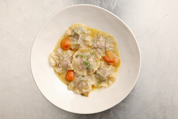 Общее тесто для равиоли лучше всего готовить из рисовой муки. Разделите его на небольшие кружки. Один из кружков смазываем слегка взбитым яйцом, выкладываем на него приготовленную начинку и накрываем вторым кружком. Очень важно плотно защипнуть края, удаляя излишний воздух, а для совершенства можно использовать фигурную формочку, чтобы обрезать края.