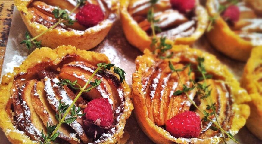 Очистить 3-4 яблока и нарезать их на мелкие кубики.В небольшой кастрюле растопить 50 г сливочного масла. Добавьте нарезанные яблоки, сахар и ванилин, заливая 100-150 мл воды. В случае сочных яблок, воду можно не добавлять.Смешивать ингредиенты на среднем огне около 20 минут, охладить. В качестве варианта, начинки можно сделать больше и хранить в холодильнике.Разогреть духовку до 210 °С. Тесто разделить на кусочки по 50 г, раскатать в тонкие круги. Поместить их в формы для кексов диаметром около 8 см и наполнить начинкой.Оставшиеся яблоки нарезать на четвертинки, удалить сердцевину и резать на тонкие дольки. Выложить по дольке сверху на каждую корзиночку.Выпекать в разогретой духовке 20-25 минут, контролируя золотистость и степень готовности теста.После выпечки, охладить на решётке, аккуратно вынуть корзинки из форм, посыпать сахарной пудрой и украсить малиной и тимьяном. Подавайте тёплыми или холодными — всегда вкусно!Эти корзиночки — не просто десерт, а гастрономическое открытие, которое украсит любой стол!