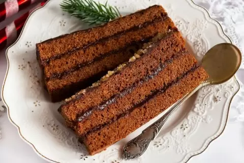 5. Каждую часть коржа разрежьте пополам вдоль, чтобы получить шесть коржей. Нагрейте джем с шоколадом и намажьте на каждый корж, чередуя их слоем. Упакуйте пряники в фольгу и оставьте в холодильнике на ночь.
