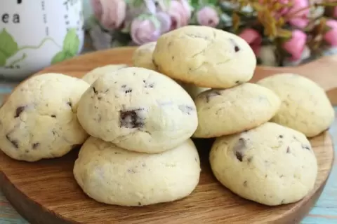 Выпекать печенье следует в заранее разогретой до 180 градусов духовке в течение 15-20 минут. Готовое печенье должно оставаться светлым и мягким. Подкрепляющее ощущение сладости придаст темный шоколад, который будет плавиться внутри каждого кусочка.