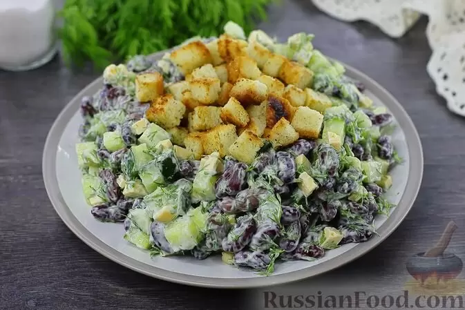 Салат из фасоли: сочетание фасоли с освежающими огурцами, сыром и хрустящими сухариками – это идеальный обед для тех, кто ценит сытность и легкость. Кроме того, это блюдо легко приготовить на скорую руку.