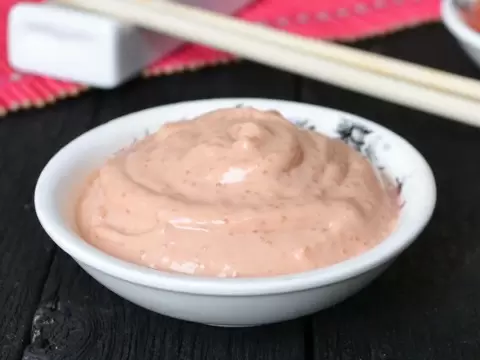 Для начала важно выбрать именно густой майонез, который хорошо удержит форму на роллах. В миске смешайте майонез с острым томатным соусом, регулируя его количество в зависимости от предпочтений по остроте блюда.