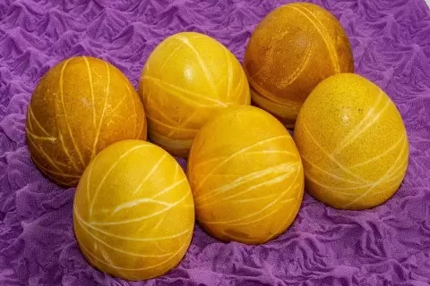10. Когда яйца остынут, снимите нитки и натрите их растительным маслом для получения блестящей поверхности.