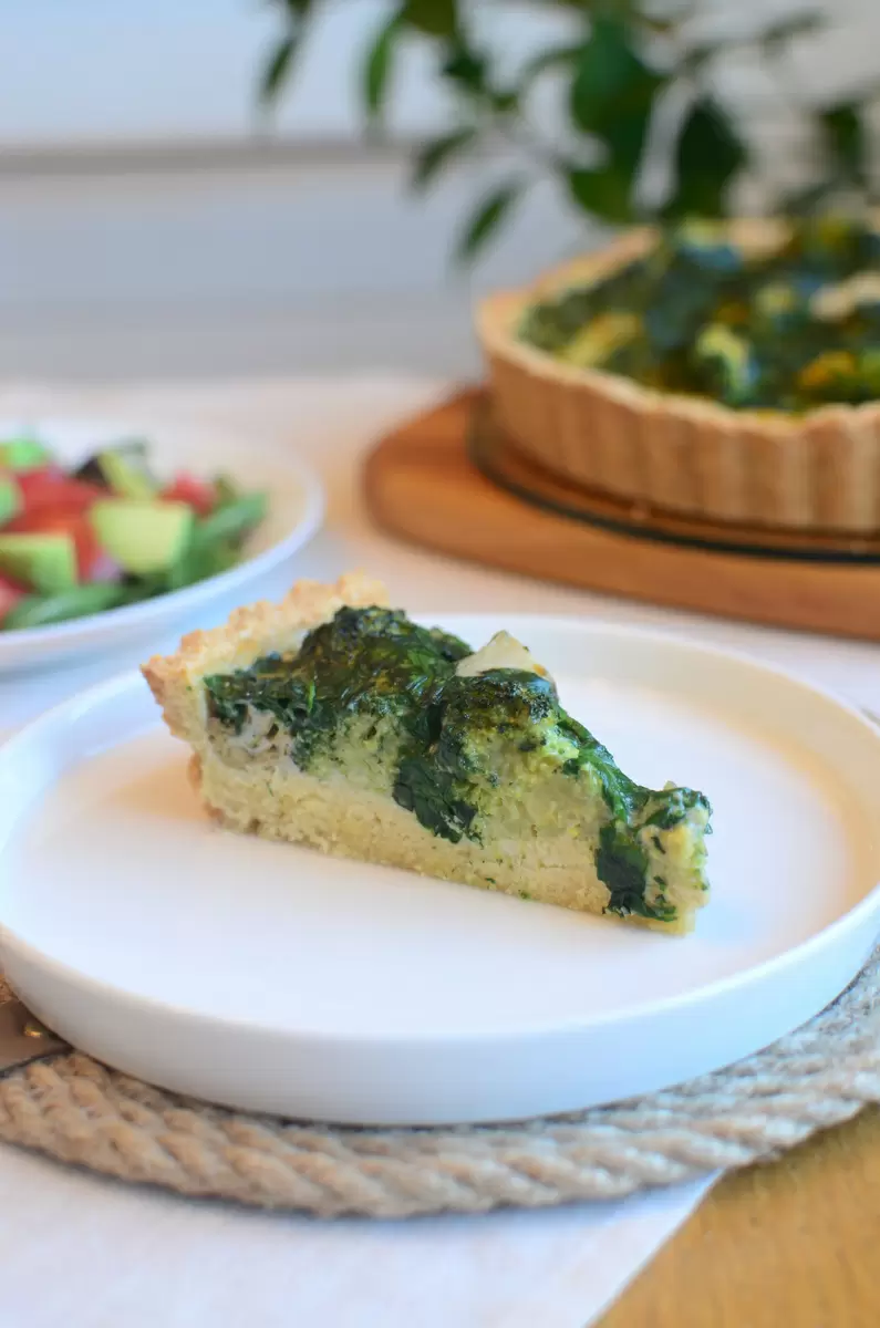 Основу пирога составляет низкоуглеводное песочное тесто с хрустящей корочкой, а в начинку входят здоровые зелёные овощи: брокколи, шпинат и немного артишоков для изысканного вкуса. Заливка из яйца и кокосового молока добавляет сочность. Весь состав начинки можно менять в зависимости от предпочтений. Рецепт теста также невероятно гибкий; его можно использовать для приготовления тарталеток, о которых также делились в других кулинарных блогах.