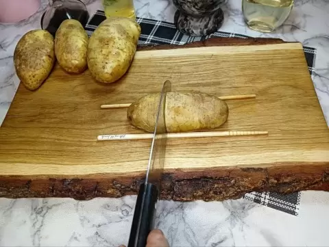 Первым делом необходимо тщательно промыть картофель в кожуре, а затем нарезать его дольками, не доходя до конца. Для этого идеально подойдут палочки для суши, которые стоит положить под картошку на доску.