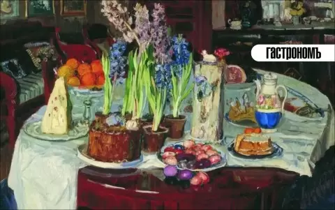 На пасхальном столе можно было увидеть удивительное разнообразие блюд. Художники той эпохи, такие как Кустодиев и Жуковский, запечатлели в своих картинах детали этих изысканных застолий. На плите можно было найти как классические куличи и творожные пасхи, так и мясные деликатесы, среди которых особенно выделялись свиной окорок и жареный молочный поросенок. Стол накрывался наливками и другими алкогольными напитками, давая понять, что пост закончился и пришло время праздника.