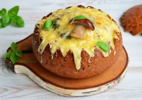 Хлебная форма наполняется грибной начинкой, сверху обильно посыпается натертым сыром. Чтобы жюльен не расползался, стоит разместить его в формочке из фольги и поместить на противень для запекания. В заранее разогретой до 180°C духовке жюльен запекается около 10-15 минут, пока сыр не покроется аппетитной золотистой корочкой.