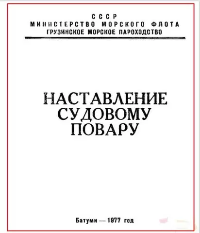 Меню, основанное на рекомендациях Бориса Сергеевича Абазнева, опытного судового повара и наставника Грузинского морского пароходства, служит настоящим путеводителем по кулинарии для моряков. С 1932 года Абазнев отдал 40 лет своей жизни службе на флоте, и в момент написания книги "Наставление судовому повару" он продолжал работать, с удовольствием передавая свои знания.