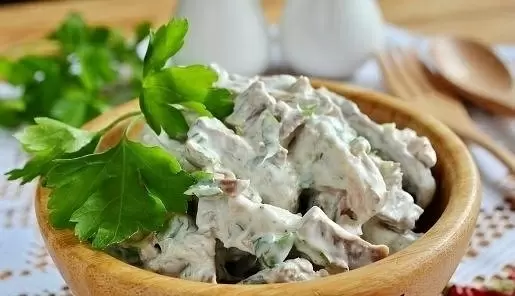 Как только мясо остыло, нарежьте его брусочками поперек волокон и соедините с приготовленным соусом. Перемешайте так, чтобы мясо хорошо пропиталось ароматами зелени.