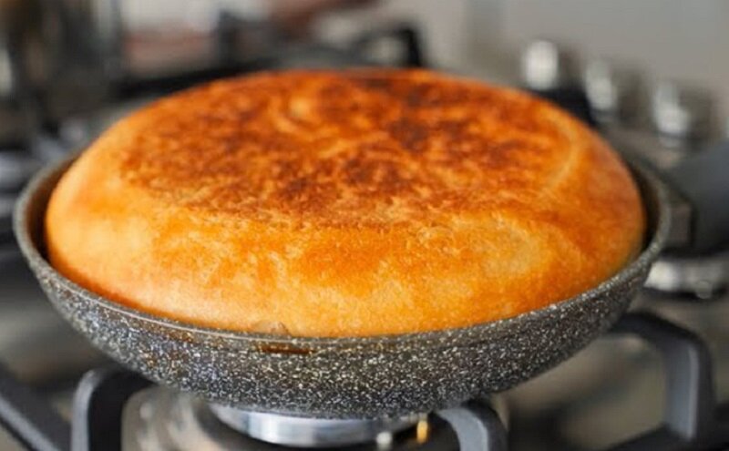 5. Прогрейте сковороду на медленном огне и смажьте ее маслом. Выложите тесто, накройте фольгой (оставляя пространство для подъема) и, по желанию, дополнительно закройте крышкой.