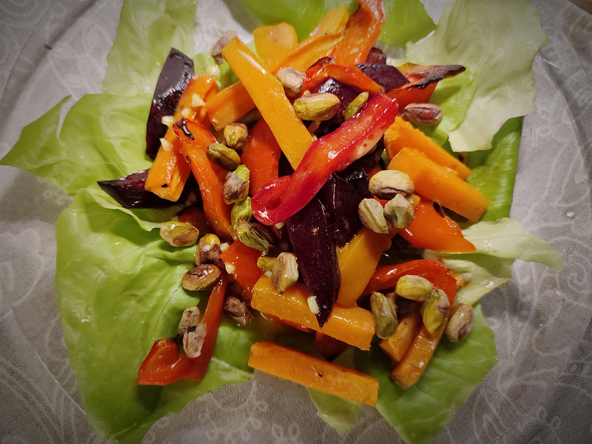Овощи запекаются в духовке на протяжении 30-35 минут в режиме верх/низ, чтобы сохранить их сочность. Тем временем подготовьте салат: нарвите листья на крупные кусочки и уложите их на тарелку. Для заправки выжмите сок из апельсина, процедите его и смешайте с другими ингредиентами до образования однородной эмульсии. При желании, добавьте натёртый чеснок для пикантности.