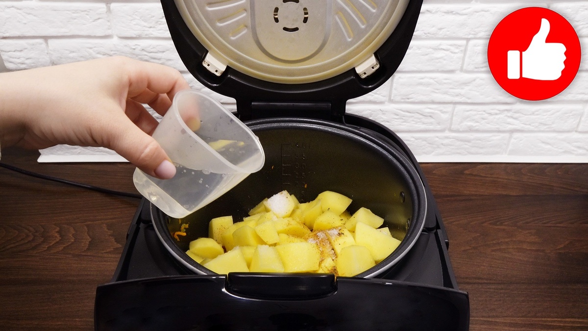 Сначала необходимо разогреть подсолнечное масло в режиме "жарка" мультиварки. В оставить на 3 минуты свиные ребрышки, затем добавить нарезанный лук и морковь. Продолжать жарить еще 3 минуты, не перемешивая. После завершения жарки отключить режим и добавить нарезанный картофель, соль, специи и горячую воду. Не перемешивайте ингредиенты.
